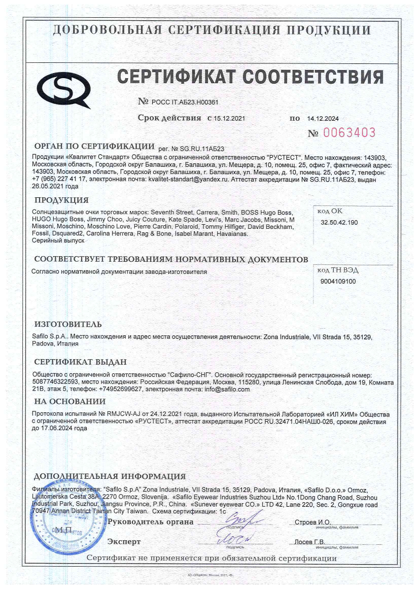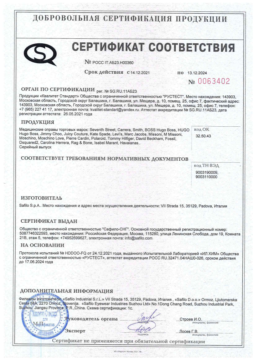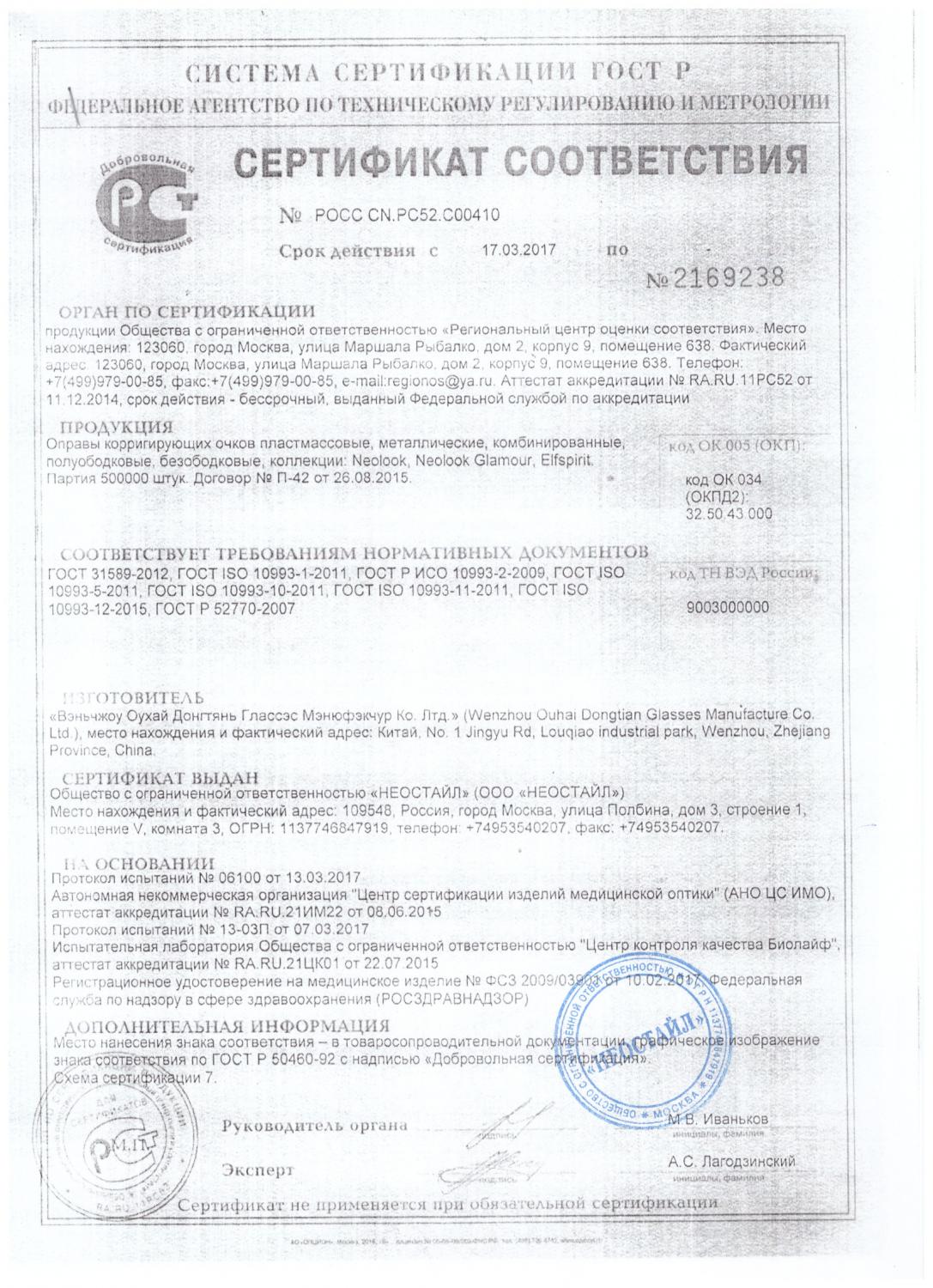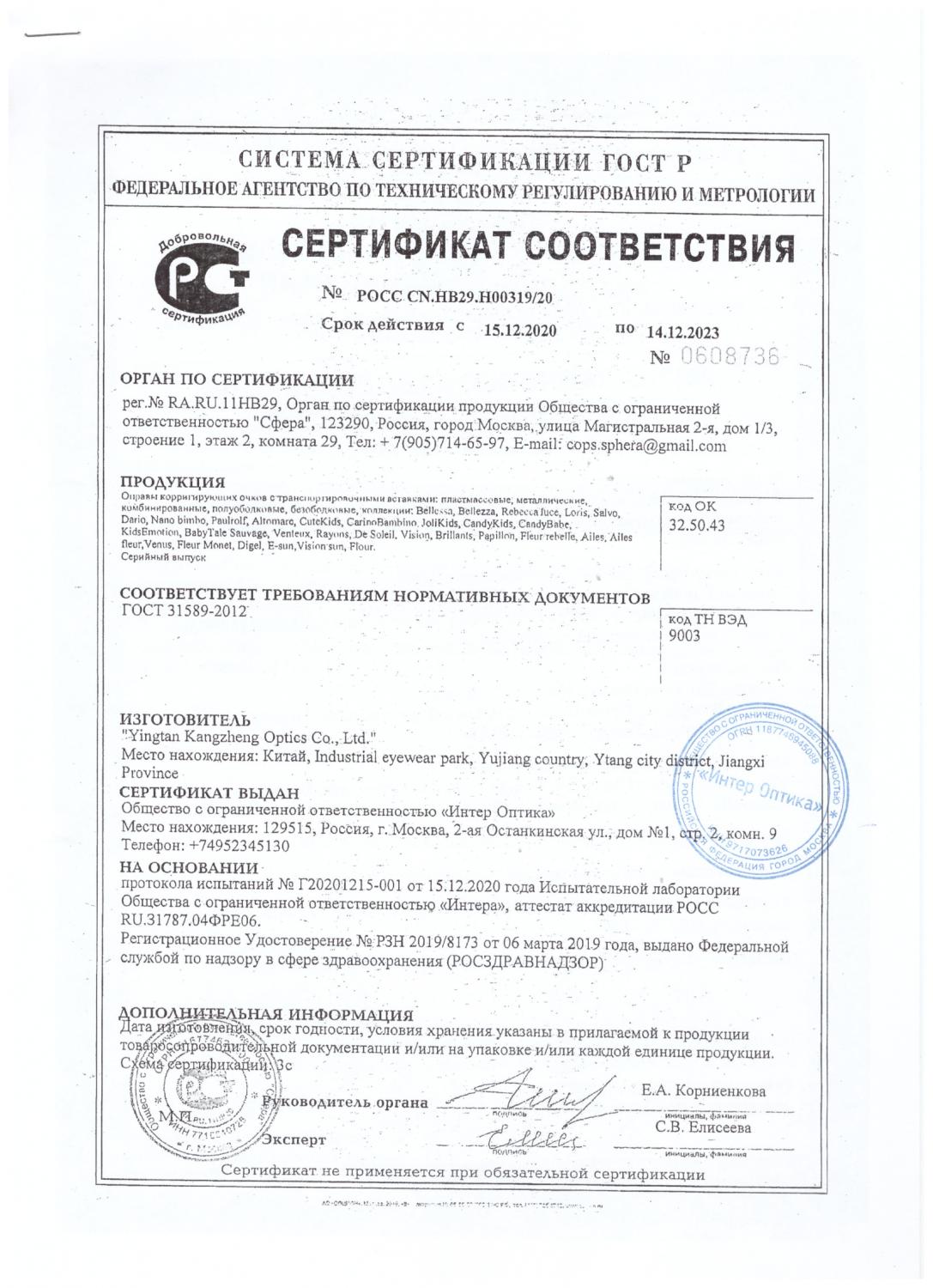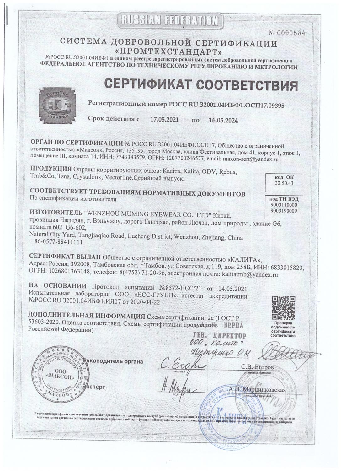 Сертификат соответствия — документ, подтверждающий соответствие продукции требованиям качества и безопасности, установленными для нее действующими стандартами и правилами. Вся продукция наших оптик сертифицирована и сеть оптик Kalinza работает только с ведущими поставщиками оправ, линз и другой продукции.