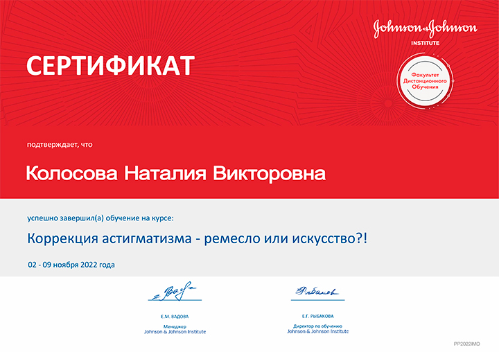 - После курса "Коррекция астигматизма — ремесло или искусство?" внедрила новые методы коррекции астигматизма, что значительно повысило точность подбора средств коррекции для пациентов с астигматизмом.